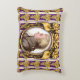 The original artwork by ZoeSPEAK on this Accent Pillow features a portrait of the classical music composer Wolfgang Amadeus Mozart. The portrait is a profile set in an ornate oval golden frame. The frame hangs on a purple wallpaper background with golden bunches of grapes in rows, and vertical white and lavender stripes.