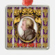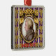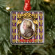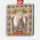 The design on this Metal Ornament is a portrait of the classical music composer Wolfgang Amadeus Mozart. The portrait is a profile set in an ornate oval golden frame. The frame hangs on a purple wallpaper background with golden bunches of grapes in rows, and vertical white and lavender stripes. Under the frame it says MOZART in red letters.