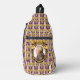 The original illustrations by ZoeSPEAK on this Sling Bag feature a portrait of the classical music composer Wolfgang Amadeus Mozart. The portrait is a profile set in an ornate oval golden frame. The frame hangs on a purple wallpaper background with golden bunches of grapes in rows, and vertical white and lavender stripes.