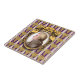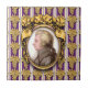 The original illustration by ZoeSPEAK on this small Ceramic Tile features a portrait of the classical music composer Wolfgang Amadeus Mozart. The portrait is a profile set in an ornate oval golden frame. The frame hangs on a purple wallpaper background with golden bunches of grapes in rows, and vertical white and lavender stripes.