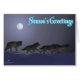 A cold, moonlit winter night; a wolfpack on the prowl. "Season's Greetings" appears in glowing blue and white.
