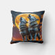 Two majestic wolves stand atop a rocky outcrop, howling together as a bright full moon illuminates the night sky, surrounded by silhouettes of pine trees.