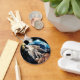 a keychain with a picture of a wolf pup howling with an adult wolf in the background also howling. also in the background is a picture of the earth and moon.
