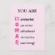 Add your own text or a name to personalise this inspirational postcard. The design celebrates what it means to be a woman, using the letters of WOMAN in an acrostic: "Warm hearted, Open minded, Multi talented, Awe inspiring, Never wrong!"