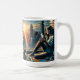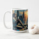 Pretty comic book style pop art lady looking out of her city window drinking coffee, watching the sunset with her cat.
