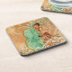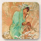 This drink coaster set with a cork back has a mysterious lady dressed in a long hooded mint green shawl sitting in the branches of a golden tree covered with snow holding a bird.