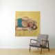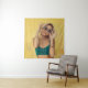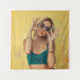 Woman in blue bralette holding sunglasses putting tapestry