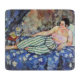 This design features a painting by the French artist Suzanne Valadon (1865–1938). It shows a confident curvy woman reclining on a sofa; she is smoking and looks self-assured. There are books beside her, a symbol of her intellecutal interests. The model can be seen as a feminist icon. The work uses strong colors and makes use of decorative backgrounds and patterned materials. The original painting was completed in 1923 and its French title is "La chambre bleue" [The Blue Bedroom].