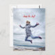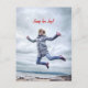 Uplifting series: A great postcard featuring a photo of a woman jumping for joy off some rocks on a beach. Her arms and legs are partially outstretched, turning it into a crab jump. She's wearing a padded jacket against the cold and her hair is lifting in the wind. With a happy expression and eyes wide, the overall impression is of wild exuberance.