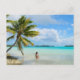 Postcard of a woman in bikinis under a hanging palm tree in the shallow water of the lagoon at the beach of a tropical island in the pacific archipelago French Polynesia.