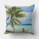 Throw pillow of a woman in bikinis under a hanging palm tree in the shallow water of the lagoon at the beach of a tropical island in the pacific archipelago French Polynesia.