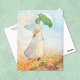 A fine art postcard with the painting, Woman with a Parasol Facing Right (also known as Study of a Figure Outdoors, Facing Right) (1886) by Claude Monet (1840-1926) who was a French Impressionist painter. A portrait of a woman holding a green parasol standing in a spring meadow with a brilliant blue sky.