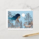 Woman with reindeer in the snow by log cabin holiday postcard