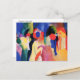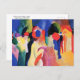 A postcard with the watercolor painting, With a Yellow Jacket or Mit Gelber Jacke (1913), by August Macke (1887-1914), a German Expressionist painter. An abstract depicting a group of people with a woman in a yellow jacket in the foreground.
