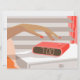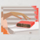 Womans hand pushing on alarm clock snooze button card