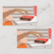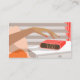 Womans hand pushing on alarm clock snooze button enclosure card