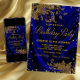 Womans royal blue and gold birthday party invitation with elegant gold glitter swirls on a beautiful royal blue satin background. This royal blue and gold birthday invitation is easily customised with your event details. The "Birthday Party" text cannot be changed.