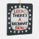 An irreverently weird typographic animal design that says "Look! There's A Wombat Now". It features black and red text on a white rectangle with funky, playful white dots surrounding it, all on a grey background.
