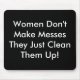 Women Don't Make Messes is a humourous statement product. This highlights the fact that women should not have to clean up someone else's mess. Unfortunately, many women can still relate to the fact that they are often left cleaning up after others. If you are one of those women who can relate to this, then you can appreciate the humour in this statement.