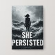 A striking black-and-white wall art print featuring the silhouette of a woman standing strong amid turbulent waves. With her hair blowing in the wind and posture upright, she faces the storm with unwavering resolve. Bold typography beneath her reads: "SHE PERSISTED", symbolising strength, endurance, and courage in the face of adversity. The dramatic seascape emphasizes the power of inner strength and resilience, making this piece a bold statement for empowerment.