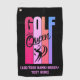 Buy this colourful Women's GOLF QUEEN Custom Name Women's Golf Towel with CUSTOMIZABLE TEXT, designed for women golfers. The artwork shows bold typography spelling GOLF with columns of vibrant colours. The word QUEEN is written in a script font with a crown and there is a black silhouette of a woman giving a golf swing. This Women's Golf Queen Golf Towel would make a great golfing accessory for your golfer friends when going around the green. Using this Golf Queen Golf Towel won't improve your golf swing, help you to break par, or even avoid bogeys BUT it'll add some much needed fun and colour. Buy these women's Golf Towels for your next day out or for your golf-themed bachelorette party or to use at golf tournaments throughout the golf season. Matching items available. Comes in vintage colour version.