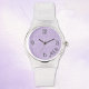 I only have one complaint. I ordered the watch with clear case and strap, and what was sent was white case and strap. I'm going to keep it because 1) it looks very nice in white, and 2) it would take too long to get a replacement made and sent in time for my occasion. Aside from the mix up with the color, the watch does look very good in white. The purple dial is actually sparkly which did not show in the online images. That was a nice surprise. If you like Swatch watches this is very similar to those. It's 33.6mm in diameter, 10.5mm thick, and 40.6mm lug to lug. Stainless steel case back says 3ATM/30m WR, so no swimming or showering or submerging this one. If you like Woodstock, this is a great choice.