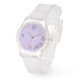 This sporty 80s style watch with durable clear silicone buckle strap and texture-looking lavender face, features calligraphy monogram initials and numbers in a subtle grey. These were called "Jelly watches" in the 80s. Easily change or remove the initials using the Template provided. To edit and change font style, font color, size and more-- use the Design Tool. White and black silicone straps are available along with 15 other styles. See "About" for more information.
