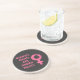 Sandstone coaster with a feminist message, features pink female symbol and "women's rights are human rights" text in brush stroke style font on black background.