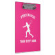 Women's tennis coach accessory custom pink clipboard. Add your own name, team name or name of club. Cool gift idea for high school coach, mum, kids league, girls team etc. Female tennis player silhouette logo with sporty typography template. Neon pink or custom colour background clip board. Double sided print.