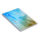 Sporty women's volleyball spiral notebook featuring a conceptual scene from a volleyball game at the beach, with custom text that reads, "sand, surf and sky ... and volleyball" - blended volleyball graphics include a volleyball and silhouetted female volleyball player jumping at a volleyball net superimposed over a turquoise, white and light brown diagonal gradient background that represents a clear blue sky, the ocean surf and a sandy beach - customise with her monogram and name - by katz_d_zynes
