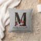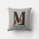 Whimsical Wonderland themed throw pillow features vintage Alice and the Queen of Hearts character colour illustrations with large letter / initial M with a black/gold/red card suites fill pattern on a vintage grey harlequin background. Personalise further with customisable name text