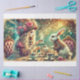 Step through the looking glass into a world of pure imagination. Soft watercolor washes create dreamlike effects as a girl and rabbit enjoy their magical tea party. Oversized flowers provide shade while floating treats defy gravity. This design brings storybook wonder to life.