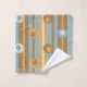 This bath towel set features a pattern of wonky polka dots and stripes in apricot, light blue, brown and cream for a modern look.
