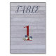 A beautiful wedding table number design by Twin Spirit Designs has a wood background adorned with blue and white flowers.