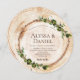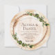 The invitation template features a rustic wood bark background, evoking the feeling of being surrounded by nature. The addition of green foliage accents adds a touch of freshness and elegance, setting the tone for an outdoor or barn wedding filled with natural beauty. Plus the unique round shape gives that added touch of a wood cut slice.