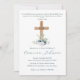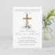 This elegant, floral custom baptism invitation features a religious watercolor image in the centre. A wood cross is accented with white and blue flowers, and delicate greenery. A sample bible verse for baptism is printed above the wooden cross.