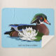 A wood duck in the water with a white water lily beside the suck in a backdrop of blue