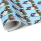 A wood duck in the water with a white water lily beside the duck in a backdrop of blue