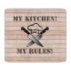 This design features a wood effect background with a graphic of two cutting knives and a chef's hat in the centre. Above the graphic it states 'My Kitchen' and below 'My Rules' written in a stencil font. The text can be changed to suit your own requirements.