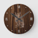Dark wood looking wall clock with graphics of an embossed looking owl, in the middle. White marbled looking roman numerals and dots represent the hours, on the perimeter of the clock. Customise to add your own text.