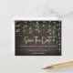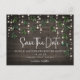 Wood String Lights Script Wedding Save the Date - The perfect Save the Date for the bride and groom who love a rustic theme. Rustic wood with glowing string lights handwritten style script typography and hanging greenery. The back of the template allows for your return address, and QR code to your wedding website.