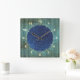 This digital art design wall clock features a blue tinted wood panel background with handwriting overlay.