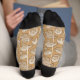 Beige mushroom icons with woodcut shading. Seamless pattern. Custom background colour. Custom top stripe colour. Custom text on each sock.