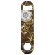 Brown wooden background with sea, mechanical ridge, an antique steering wheel, golden anchor and various gold and brass gears. Steampunk style.