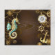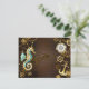Brown wooden background with sea, mechanical ridge, an antique steering wheel, golden anchor and various gold and brass gears. Steampunk style.