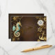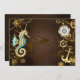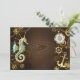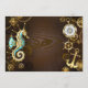 Brown wooden background with sea, mechanical ridge, an antique steering wheel, golden anchor and various gold and brass gears. Steampunk style.