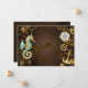 Brown wooden background with sea, mechanical ridge, an antique steering wheel, golden anchor and various gold and brass gears. Steampunk style.