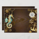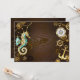 Brown wooden background with sea, mechanical ridge, an antique steering wheel, golden anchor and various gold and brass gears. Steampunk style.
