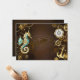 Brown wooden background with sea, mechanical ridge, an antique steering wheel, golden anchor and various gold and brass gears. Steampunk style.