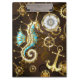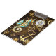 Brown wooden background with sea, mechanical ridge, an antique steering wheel, golden anchor and various gold and brass gears. Steampunk style.